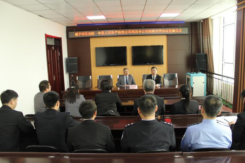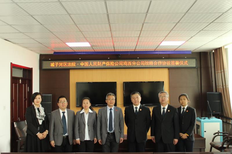 2018年5月10日,中国人民财产保险股份有限公司鸡西分公司副总经理李光、鸡冠支公司经理顾向阳、鸡冠支公司副经理侯伟明、鸡冠支公司服务专员王丹一行八人与城子河区人民法院签署战略合作协议,协议敲定在诉讼财产保全责任保险服务及执行悬赏保险服务两方面开展合作,并商定在近期继续开展执行救助等保险项目。