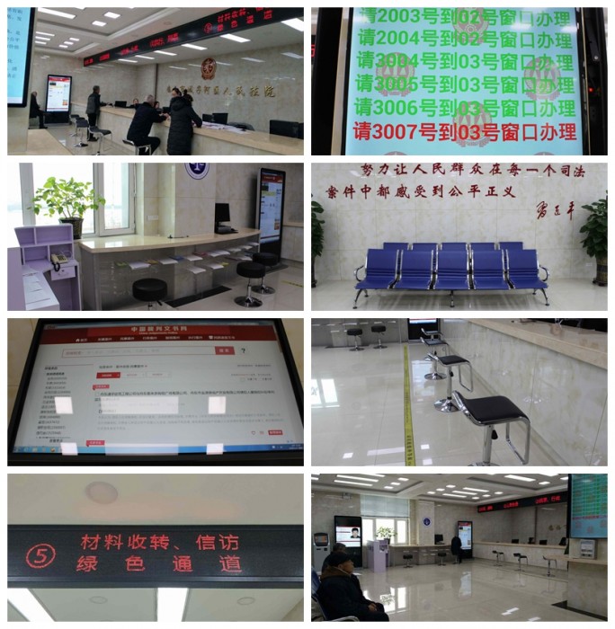 诉讼服务中心为当事人提供书写区、休息区,便于当事人书写材料及排队等候。在休息区设置电子显示屏,方便当事人了解相关法律制度、立案准备材料内容、诉讼须知等,引导当事人依法理性的通过诉讼解决争议。安放的电子触摸屏可以查询生效法律文书原文,方便当事人对类案结果预判,对自己案件合理预期,并对类似案情的证据、理论观点有直观深入了解。