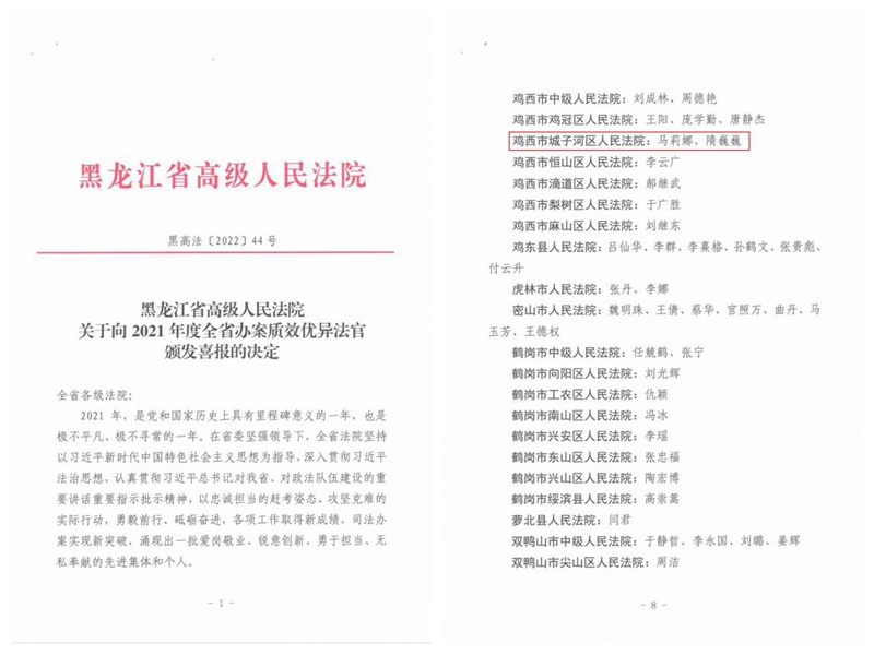 3月29日,《黑龙江省高级人民法院关于向2021年度全省办案质效优异法官颁发喜报的决定》文件下发,城子河法院2名干警受到表彰。
