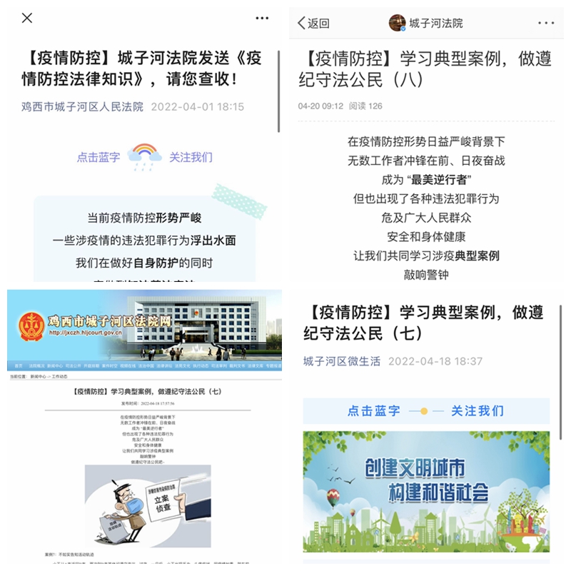 借助新媒体力量,利用本院“两微一网”及区委宣传部“城子河区微生活”微信公众号,发布有关疫情防控相关的法律知识、典型案例、普法视频等内容,直击疫情防控频发的违法犯罪行为,多角度解读法律法规,大力弘扬社会正能量,引导群众自觉遵守法律法规,做守法公民,确保真正形成万众一心、齐心抗疫浓厚氛围。