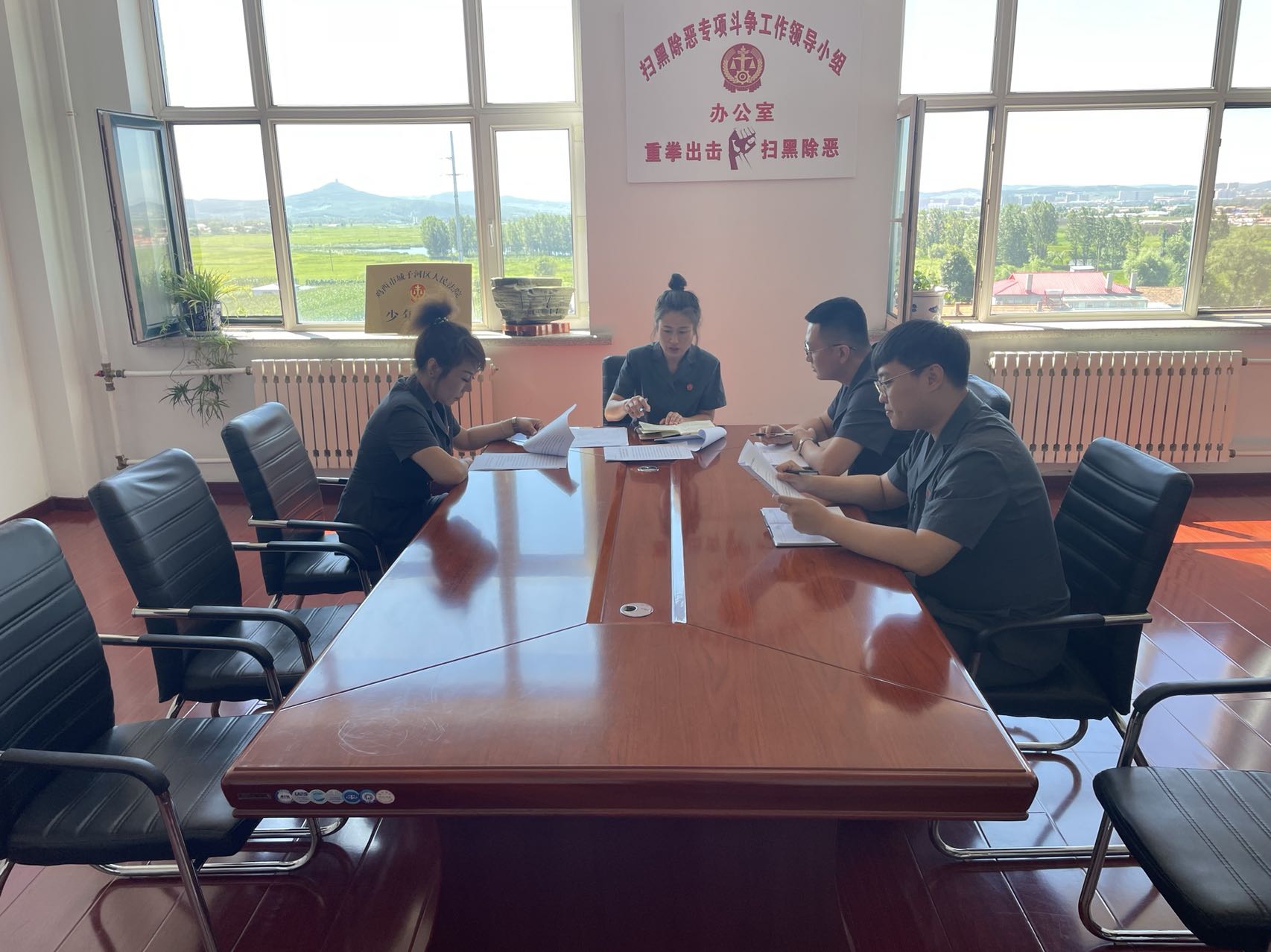 城子河法院民事审判团队召开会议专题学习并贯彻落实石院长在鸡西调研时的讲话精神和孙勇院长讲话精神,会议要求,要将石院长在讲话中强调的“六个方面”及孙勇院长讲话中的“三点意见”落实到日常工作中,永葆政治忠诚,深刻领悟“两个确立”,坚决做到“两个维护”。充分发挥审判职能,严格公正执法,确保每一起民事、行政案件都经得起检验,让人民群众在案件中都能感受到公平正义。