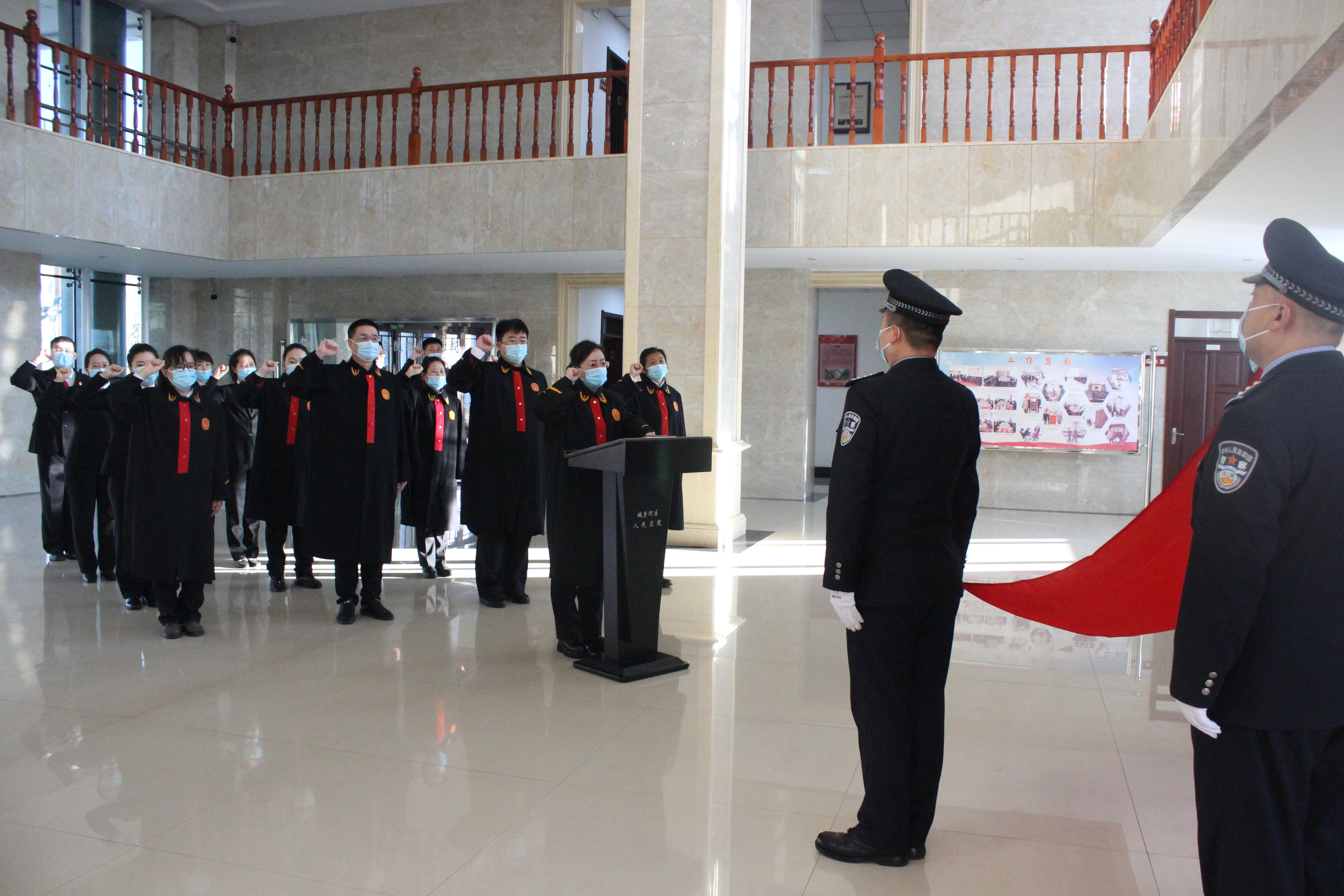 仪式开始,城子河法院法官干警制服整肃、列队站立,面向国旗,领誓人左手抚按宪法,右手举拳,诵读誓词,全体宣誓人举起右拳,向宪法许下庄严承诺。