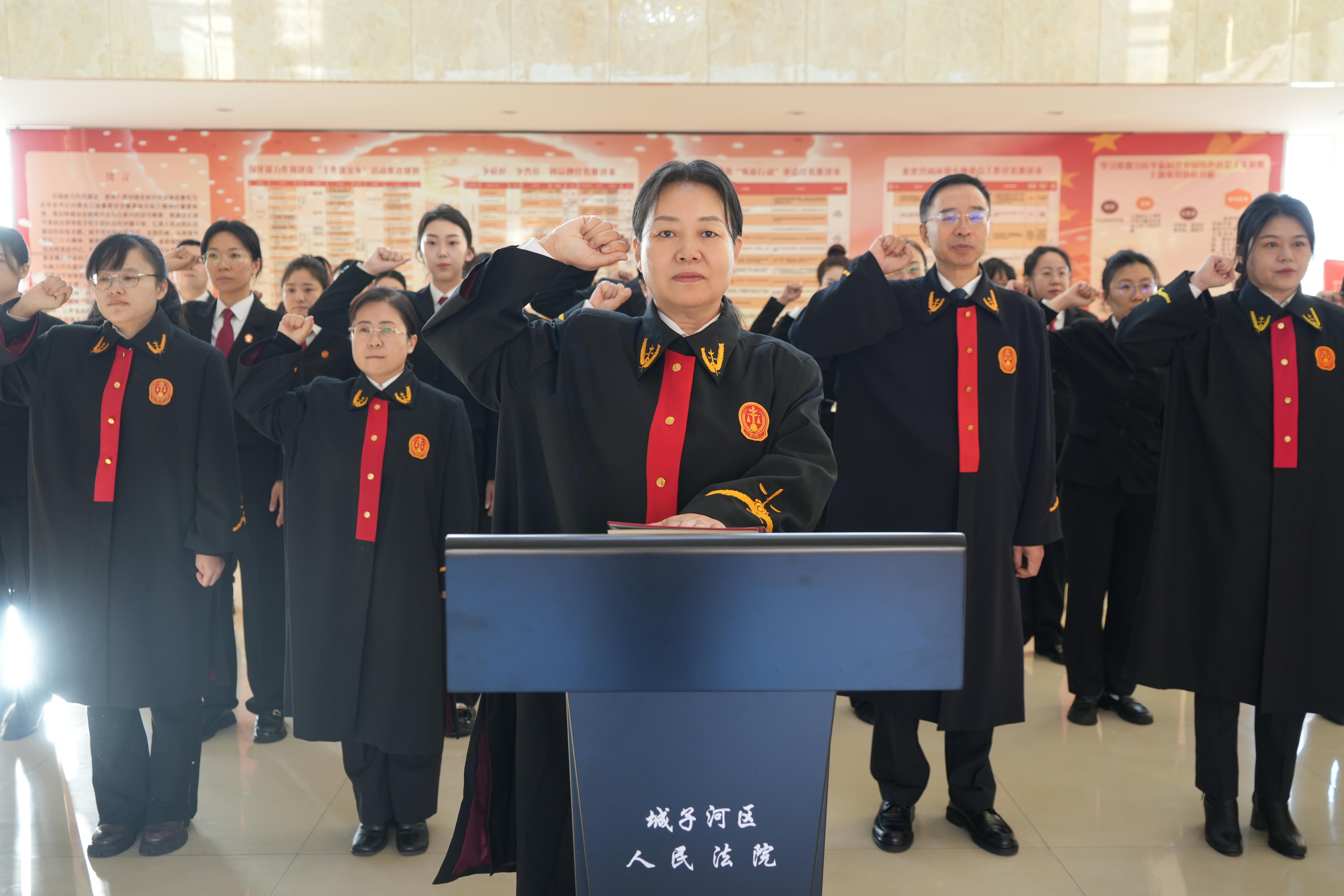 为深入学习贯彻习近平法治思想,大力弘扬宪法精神,切实增强法院干警的宪法意识与职业担当,12月4日上午,城子河法院举行宪法宣誓仪式。党组书记、院长贾玉芳身着法袍,带领全体干警面向鲜红的国旗与庄严的宪法,举起右拳庄严宣誓,以铮铮誓言彰显司法为民的初心使命。