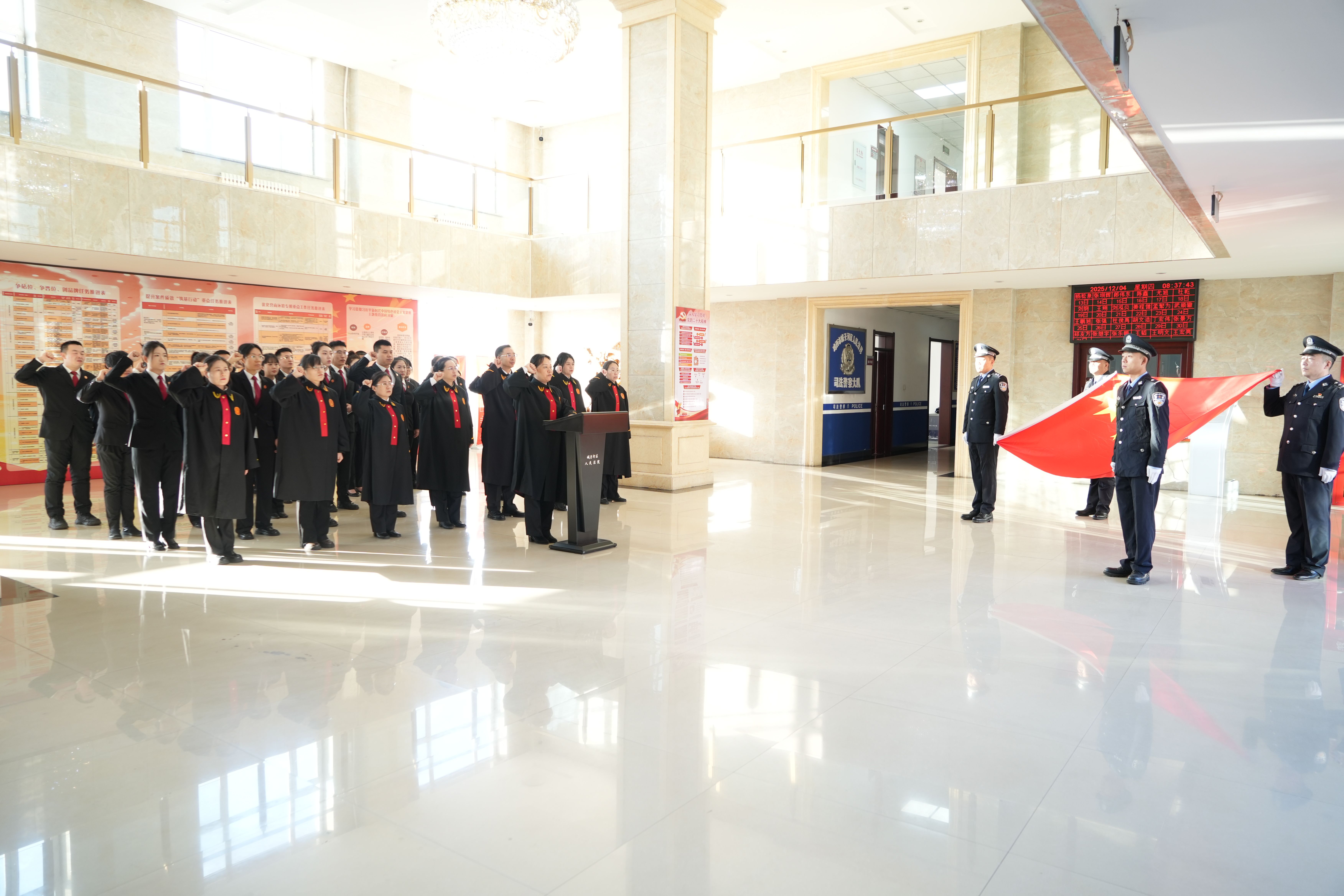 “我宣誓:忠于中华人民共和国宪法,维护宪法权威,履行法定职责,忠于祖国、忠于人民,恪尽职守、廉洁奉公,接受人民监督,为建设富强民主文明和谐美丽的社会主义现代化强国努力奋斗!”激昂的誓言回荡在大厅内,不仅是干警们对宪法的郑重承诺,更是对“努力让人民群众在每一个司法案件中感受到公平正义”这一目标的坚定表态。