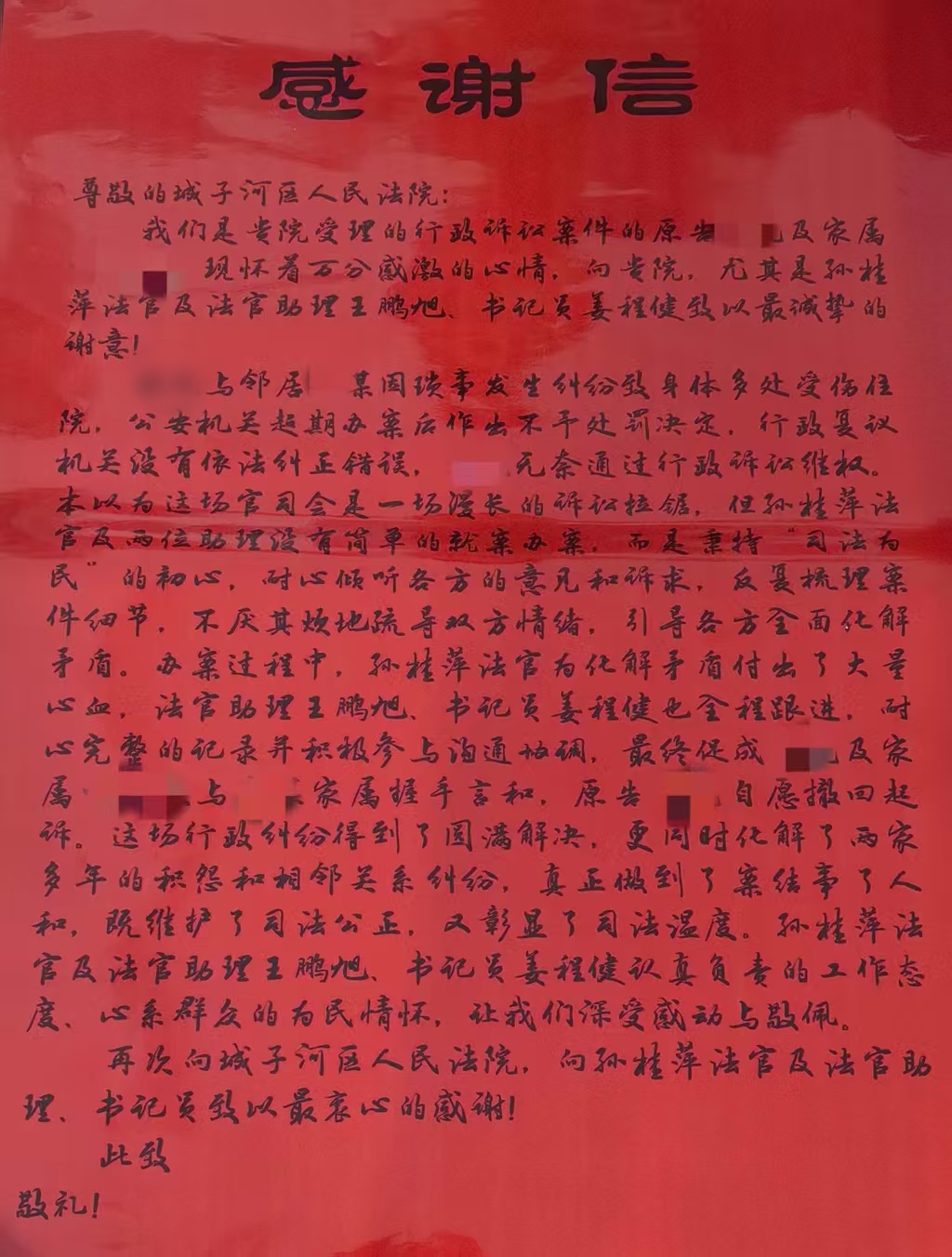 春临大地,福启新程。在丙午马年新春即将到来的喜庆氛围中,城子河法院民行审判团队收到了一份特殊的礼物——来自当事人的一封感谢信。字里行间的真挚情感,为料峭冬日注入了浓浓的暖意,也为新一年的民行审判工作写下了温暖的开篇。